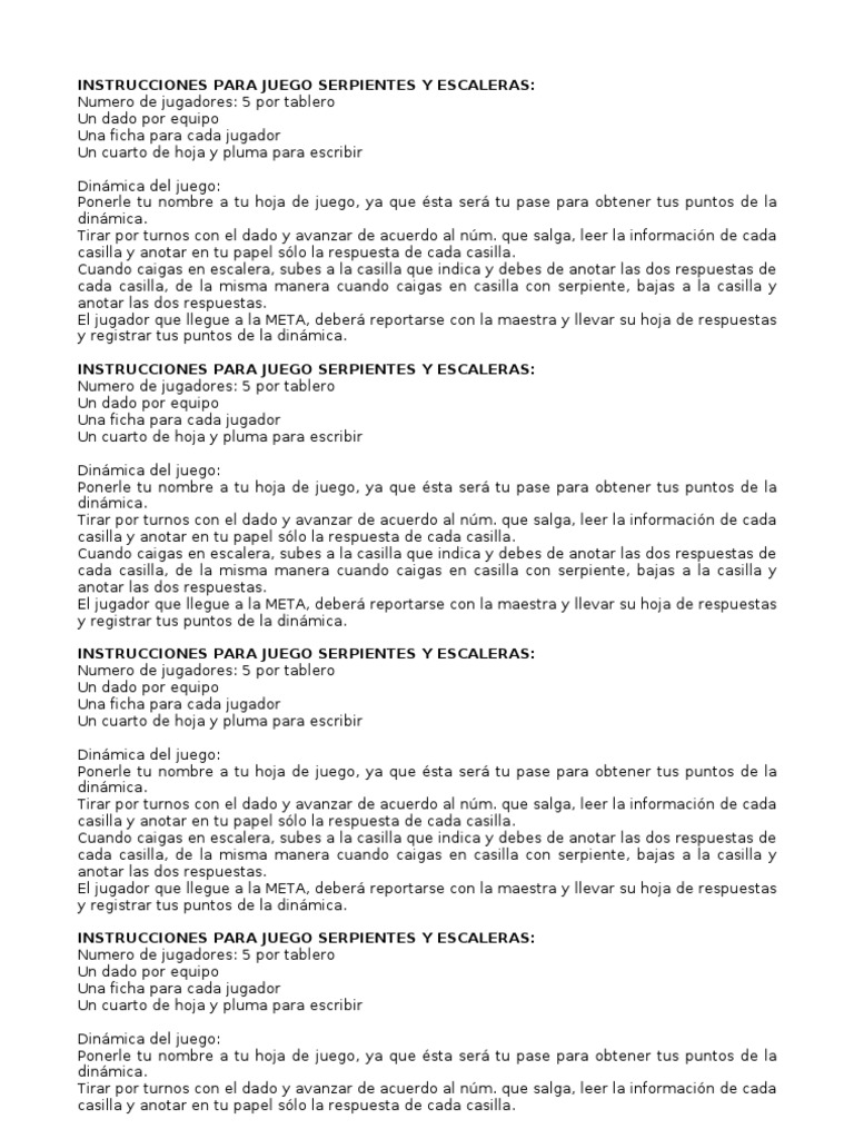 Como nos afectan los alucinogenos. El primero que llegue a la meta, será el ganador. Escaleras y serpientes reglas en oferta. Sube hasta la cola de la serpiente d. El objetivo del juego es ser el primero en alcanzar la cima moviéndose atraves del tablero de juego, desde su cuadro inicial hasta llegar al cuadro final.